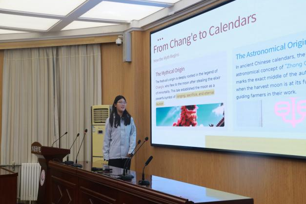 英语区的活动在主持人轻松的节日知识问答中拉开序幕,迅速点燃了现场气氛。主题交流环节中,多位中国学生作为主讲人,结合精心制作的PPT,用流畅的英语担任起中国节日文化的“讲解员”和“宣传员”。他们的内容聚焦春节、中秋节等中国传统节日,不仅系统介绍了节日习俗与传说,更深入阐释了其背后的文化内涵与情感价值,为在场观众进行了一次生动的中华节日文化导览。